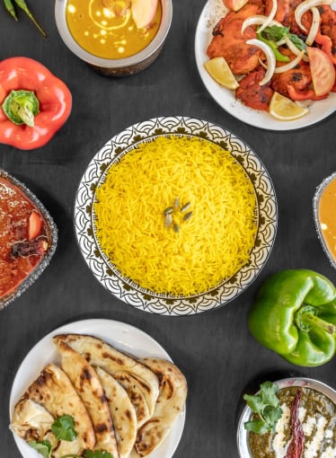 Comes with Any Choice of 2 Curries, 1 Rice and 1 Naan and Choice of Veg or Mixed Pakora and Poppadoms and Spiced Onions.